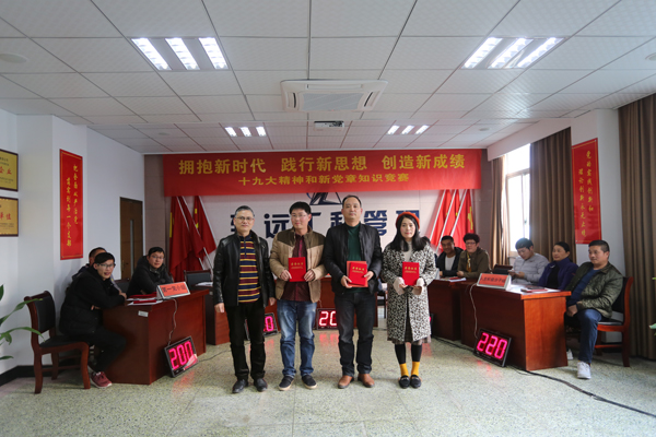 竞赛以致远支部党小组为单位参赛,每小组选3人成立一个参赛队,4个党小组4个参赛队,另加一个入党积极分子组成的参赛队,共5个队参赛。题型有单选题、多选题、抢答题等三种题型,分别由三位评委现场打分。竞赛在“团结、紧张、严肃、活泼”的气氛中进行,你追我赶,比分此高彼涨,每队各领先一时。竞赛过程中,主持人还与现场观众进行了欢快互动,答对了就有个小礼品赠送。经过3轮的激烈竞争,最后第四党小组以230分拔得头筹,第二党小组和入党积极分子组都以210分同时名列第二。后增加赛题,入党积极分子组“一键”抢先并回答正确,稳坐第二位,第二党小组错失先机名列第三。