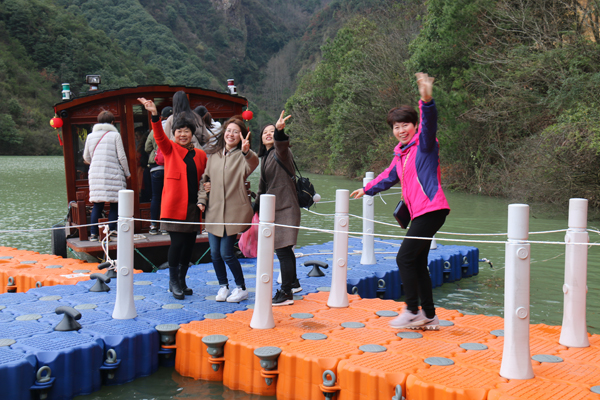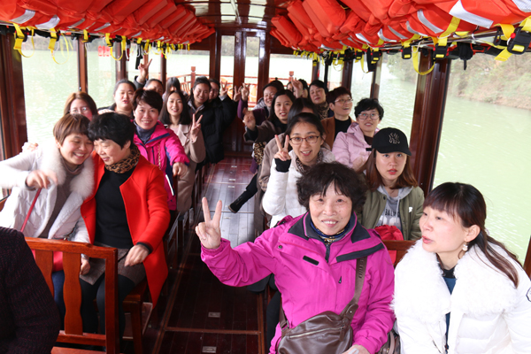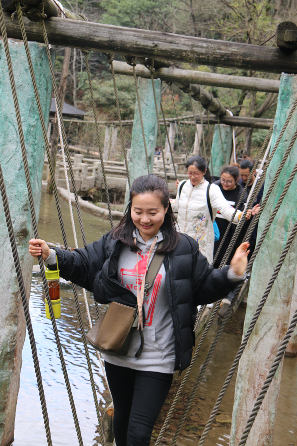 女神们首先乘船游玩一段景区,蓝莹莹的湖水让女神们惊叹不已,感觉心灵受到极大的洗礼,感叹大自然的神奇魅力。下了船,沿溪流而上,涧水淙淙,似春使呢哝;溪岸边的柳树枝头,也正吐出鹅黄的嫩芽,齐齐的向天张开小口,显出春的勃勃生机;有幸的是,山的高处,因前一夜的大雨,巨大的瀑布倾泄而下,发出如雷似的隆隆响声,真为大自然的威力而震撼。女神们也被这景色陶醉了吧,纷纷拿出手机,留下这春的时光,留下自己靓丽的色彩,嗅着这叶的清香、花的芬芳、春的气息,女神们的心情得到了完全放松。一路上,女神们还玩了荡秋千、过独木桥、滑滑梯等项目,欢歌笑语充满了整个山谷。