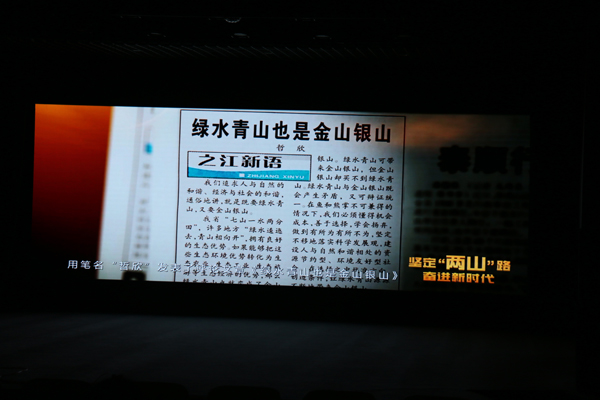 十多年前,余村这里曾是空中飞沙走石、河里泥浆遍布的“穷山恶水”景象,依靠着“绿水青山就是金山银山”的理论指导,十多年来,余村切实转变发展思路,变靠山吃山为养山富山,走出了一条生态富民的道路,实现了经济发展与生态保护的双赢。在余村村委办公大楼,党员们参观了2005年习近平同志考察余村时的工作照片,并在2005年习近平同志与镇村干部合影留念处合影。在余村大礼堂,党员们认真观看了习近平总书记“绿水青山就是金山银山”的专题纪录片,了解这一科学思想的深刻内涵。
