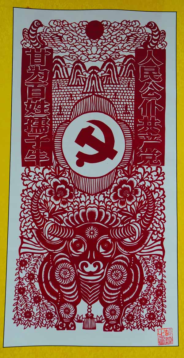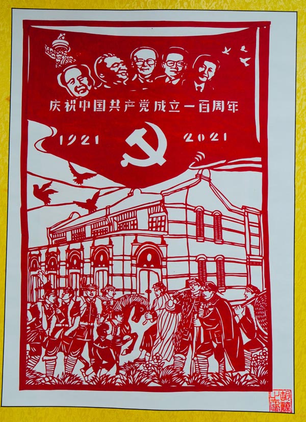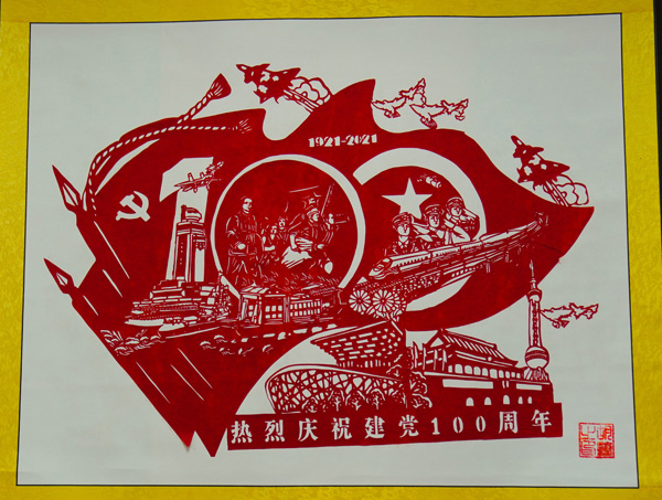 胡臻老师从剪纸的历史、用途、种类、发展四方面进行讲解,并对各种风格进行了样片展示,使大家对剪纸艺术有了大概的了解。随后,胡臻老师展示了自己的党史作品剪纸,大家都发出啧啧的称赞,并跃跃欲试。有人迫不急待地拿起来就想剪,却感到无从下手,一时茫然,在胡臻老师讲解了剪纸技巧后,才恍然大悟。于是大家按着自己的喜好,选择各自喜爱的“建党百年历程”图案开始动手剪。有的虽是针线活的高手,但剪起纸来却笨拙的很,不是剪过了,就是没剪到位,真应了那句“隔行如隔山”的老话;有的平时做事看着粗放,但剪起纸来却心细如发,一板一眼,恰到好处,可谓“兴趣是最好的老师”;有男的,虽形如张飞,却是粗中有细,剪得像模像样,直让女生自愧弗如;有经老师一点拨,马上剪得又快又好;有的相互一交流,豁然开朗,原来是可以这么剪的。剪到后来,每人都摸索出一套属于自己的剪纸本领,所谓实践出真知,八仙过海,各显神通。最后,每人都剪出了一件有自己特色的党史剪纸作品,通过装裱,并盖上姜元新党员为这次剪纸活动特别篆刻的“百年华诞”印章,成为了献礼建党100周年的最有特别意义的一件礼物,大家表示将要好好宝藏之。