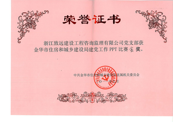 9月29日上午,在市自来水公司5楼会议室举行了由中共金华市住房和城乡建设局直属机关委员会举办的关于党建工作PPT比赛上,我公司报送的主题为“中共浙江致远建设工程咨询监理有限公司支部委员会 _创先争优的好支部 ”PPT获得金奖。