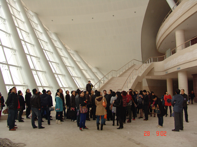 8点20分,金华市建设工程造价管理站副站长舒慧斌带领金华市建设工程造价管理协会专家组六十余人冒雨来到中国婺剧院工地现场,经过短暂的结合后,舒慧斌副站长作了现场发言,对这次研讨会深入工地现场召开的意义进行了说明,希望大家边参观、边学习、边思考,通过参观学习研磨,切实提升自身的业务水平。随后,中国婺剧院项目监理总监童健波带领协会会员逐一参观了婺剧院的主要建设成果,并详细讲解了复杂的施工要求和过程以及使用的新工艺、新材料,特别是东立面点式幕墙、东大堂穿孔钢板吊顶、高支模脚手架、钢网架脚手架、石材镜面处理、舞台,其独特的构造和要求,都对造价管理和施工提出了很高的要求。参观完中国婺剧院,与会人员还到金华体育中心项目施工现场参观学习。