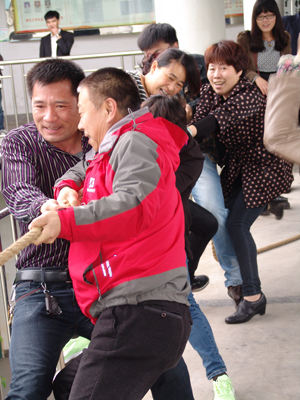 去的时候,似乎还下着小雨,当我们到达社区的时候,天却放起晴来了,太阳也露出了笑脸,好像在欢迎我们的到来。我们来到二楼活动室,里面挤满了人,已有共建单位在开展活动了。首先是投掷飞镖、乒乓垫球、单人跳绳三连环运动,每个单位选四人组成一组,以用时最少的队为胜队。我公司选组的四人,表现不错,取得了较好的成绩。最后一项是拔河赛,有六家共建单位参加,分两两对抗,我公司和枊湖小学抽到第三组。前两组队因力量比较悬殊,还未来得及喊“加油”就分出了胜负,轮到我们第三组,双方实力旗鼓相当,拔河进入了持久战,比赛高潮一波又一波,每边啦啦队 “加油”的呼喊声响彻整个枊湖社区的上空,经过几个回合的激烈拉锯战,终因我方人员体力率先耗尽而无缘决赛,但队员顽强拼搏和团结协作的精神受到了社区和活动人员的交口称赞。
