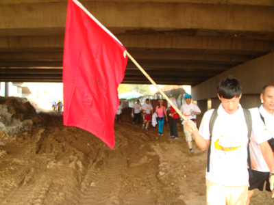 公司毅行队伍经过建设中的丹溪大桥桥洞
