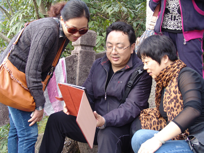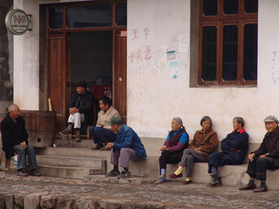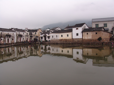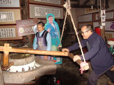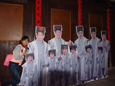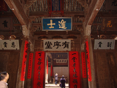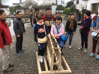 走进村庄,鹅卵石的小道连接着整个村庄,整个村庄基本上都是白墙黛瓦的老房子,阡陌交通,沟渠井然,卫生干净,确实是人居佳境。村中还参差坐落有几家卖土特产、酒家、手工艺品、小玩具等店铺,给人多了一份生活的温馨与留恋。村口有一口大池塘,在三面青砖黛瓦的映衬下,显得格外的古朴与宁静,池塘边有些老年人聚在一起聊天晒太阳,一派安详闲适的生活。我们参观了村中五个厅堂,其建筑之结构精巧、雕梁画栋、悠久历史、恢宏壮观令人惊叹。有人还因此认真地研究起古建筑的营造学来,说不定什么时候监理用得到,可谓用心良苦。在参观过程中,有人玩起了推独轮车的运动,有的试试推石磨磨豆腐活动,有的做起了酒店的店小二,有的与《爸爸去哪儿了》节目拍摄图合影,有的力拔山兮举石锁......快乐的声音久久回荡在新叶古村上。