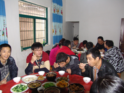 参观完新叶古村,我们在村中的“西山人家”吃中饭,山中古朴的农家菜让大家感到别样的清新可口,个个赞不绝口,原来食物的真味是如此的诱人!