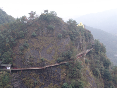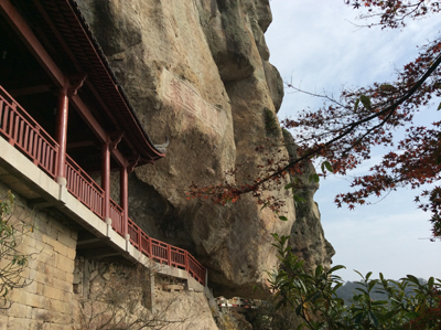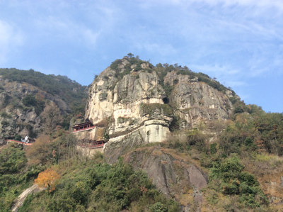 下午,大巴车载着我们来到附近的大慈岩,这时,躲在云层中的太阳也露出了笑脸,好似欢迎我们的到来。在阳光的照耀下,我们在大慈岩景区门口抬头就能望见山顶金光闪闪的大佛,正笑脸迎接我们。我们踏着金黄落叶的古道拾阶而上,清新的空气洗涤我们的尘肺,花叶的清香清醒我们的头脑,工作的辛苦、生活的烦恼在此抛到九宵云外,生活的真谛在此得到感悟。攀登虽感体力受累,但与亲临自然山水的那种快感相比,自是一种享受和乐趣。当大家都亲临山顶一览众山小之时,祖国大好河山尽收眼底,一种豪迈之气不觉油然而生,皆言不虚此行。