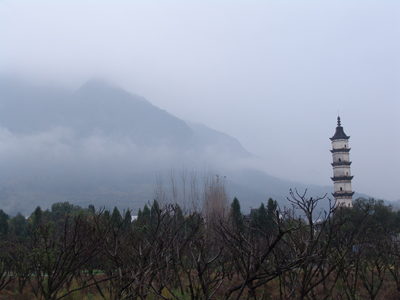 大巴上高速,至建德下高速,穿过山间弯曲的公路,约行2小时多,在半圆形山体环围的山脚下,远远就望见一高高的白塔,在雨后的青廓下显得特别醒眼,有人说这就是湖南卫视《爸爸去哪儿了》节目曾经的拍摄地新叶村,整车的人一下子兴奋了起来,惊喜和赞叹声瞬间充满着整个车厢。