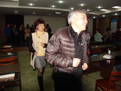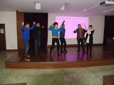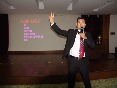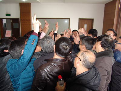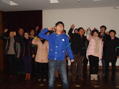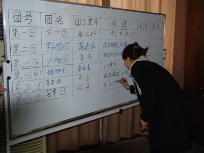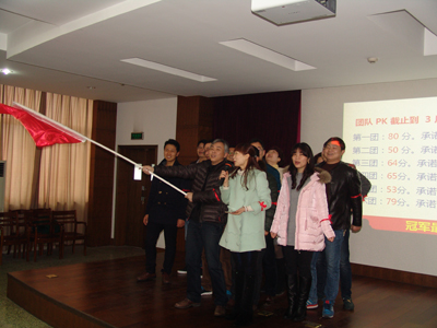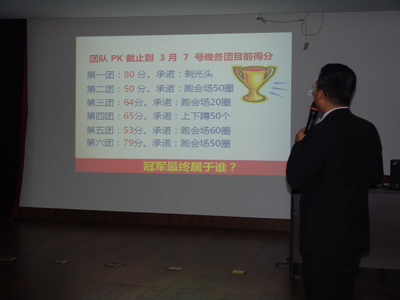活动把所有参加人员按照循环报数分成六个团队,以PK、竞争的方式进行。首先,每个团队选出一个团长和政委,确定团队名称,并对竞争结果作出承诺。然后,唐朝营老师在授课的同时,提出问题,由各团队员抢答,按各团队人员回答问题的准确度给予相应团队适当的分数,并累加各团队所得的分数,作为各团队竞争的总分数。第一团队承诺不拿冠军团长“剃光头”、第二团队承诺不拿冠军团长“跑会场五十圈”、第三团队承诺不拿冠军团长“跑会场二十圈”、第四团队承诺不拿冠军团长“上下蹲五十个”、第五团队承诺不拿冠军团长“跑会场六十圈”、第六团队承诺不拿冠军团长“跑会场五十圈”。俗话说,有压力就有动力,此话真实不虚。在作出上述承诺后,各团队员都自感压力不小,在抢答问题的时候,举手个个奋勇当先,唯恐落他人之后,抢答场面一度火爆。第一时段,一团小步领先;第二时段,六团领先。“在竞争面前,压力越大,动力越大。”此话此时在这里得到了最佳诠释,作为六个团队中唯一承诺要求“剃光头”的第一团队,在第三时段的竞赛中,爆发出了超常的能量,以遥遥领先的总分数问鼎了“执行力内训冠军”奖杯。而作为其它五个团队团长,此时也“愿赌服输”,该蹲的蹲,该跑的跑。在他们的带领下,后来陆续有人加入了奔跑的队伍,最后竟汇成了全体人员奔跑的洪流,充分体现了我们致远人在竞争环境下的勇气、责任、担当和团结奋发的有为精神。