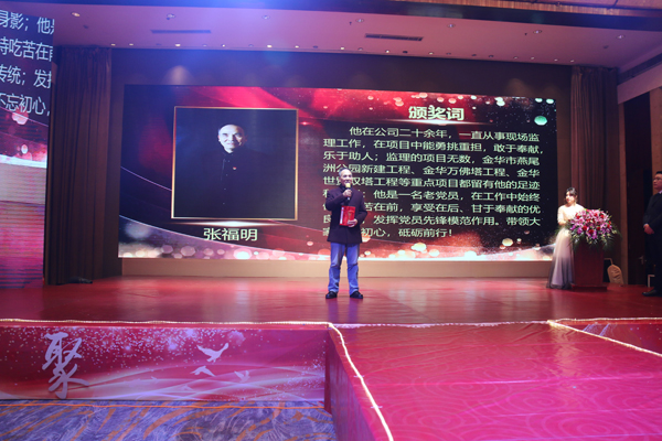 大会首先由公司总经理卢一奇致辞,他回顾道:2018年,公司在决策层的坚强领导下,在巩固本地市场的同时,实施“开拓高铁3小时经济圈”走出去的战略,全体员工继续发扬致远人“开拓进取、匠心致远”的拼搏实干精神,齐心协力,共谋发展,使“致远”继续保持了良好的发展势头。按三年发展战略规划,公司四大业务板块(监理、咨询、BIM、全过程工程咨询服务)布局已基本搭建完成。经过公司上下努力,超过年初既定的目标,达到“致远”监理业务、咨询业务的历史新高。同时,2018年公司各项资信、社会荣誉的获取上也有突出成绩,通过大家的努力,公司成功获得了金华市人民政府质量奖,这是政府对企业的最高荣誉奖励,这也是对致远公司整体管理水平的肯定,更是对我们工作的激励。BIM作为一种新业态,将成为公司的增长业务而展开,短短1年时间已完成多个项目的业务,获得业主的好评并已取得一定的经济成效。公司今后将逐步转型升级为全过程工程咨询服务企业,今年被市住建局授予第一批全过程工程咨询试点企业,并在年末成功中标1400万元的金华市第二生活垃圾焚烧发电全过程工程咨询项目。我们有理由相信,凭借这一良好的开端,再加上致远人的信心、匠心、责任心和勇气,全过程工程咨询业务一定会越做越大、越做越强。接着,致远2018年度表彰大会在豪迈的音乐声中拉开了序幕,获奖的有钱江杯、双龙杯、文明标化、市政园林金奖等项目监理部;有公司优秀监理部团队;有省优秀总监;有公司优秀总监、优秀监理工程师、优秀监理员;有营销金奖、营销明星奖、营销新人奖、回款明星奖;有优秀中层管理者、优秀员工、优秀通讯员奖;有特殊贡献者奖;有二十周年员工功勋奖……这一项项奖励,凝聚了每个致远人的辛勤汗水和智慧。有的面对困难,从容不迫,披荆斩棘;有的面对挫折,锲而不舍,永不言弃;有的勤勤恳恳,工作负责有担当;有的技术过硬,敢于迎接挑战;有的工作积极主动,善于理论结合实际……他们凭着对事业的执着追求和顽强的拼搏精神,创造了一个又一个的佳绩,他们用坚定的信念绽放生命的光彩,书写致远人的新篇章。他们的成绩来之不易,他们的事迹激励着致远员工砥砺前行,令人鼓舞,催人奋进!如特殊贡献奖张福明同志是一位老党员,二十多年以来,一直默默奉献在一线安装监理工作岗位,在项目中勇挑重担。金华世贸双塔、金华市燕尾洲公园、金华万佛塔等重点工作都流有他的心血和汗水,为社会为公司作出了很大的贡献。他是一名老党员,在工作中始终保持吃苦在前、享受在后、甘于奉献的优良传统,发挥党员先锋模范作用。这样的员工在致远还有很多,他们都是致远发展的坚强力量。公司领导上台为每位得奖者颁发了奖励证书和奖金,并希望他们来年取得更好的成绩。