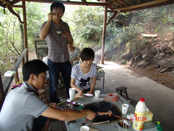 饱览山顶风光之后,团员们沿着石阶陆续回到了山脚下,在尖峰山脚下的烧烤场,团员们还进行了趣味烧烤活动。组织者准备了一些智力问答题,答对题目的人,可以领取食材一份,答错题的人则要为大家表演节目后才能获取食材。大家一起和乐融融,虽说有时烤出的食物五味不佳,但是吃着大家用心做出来的东西,也是别有一番风味!